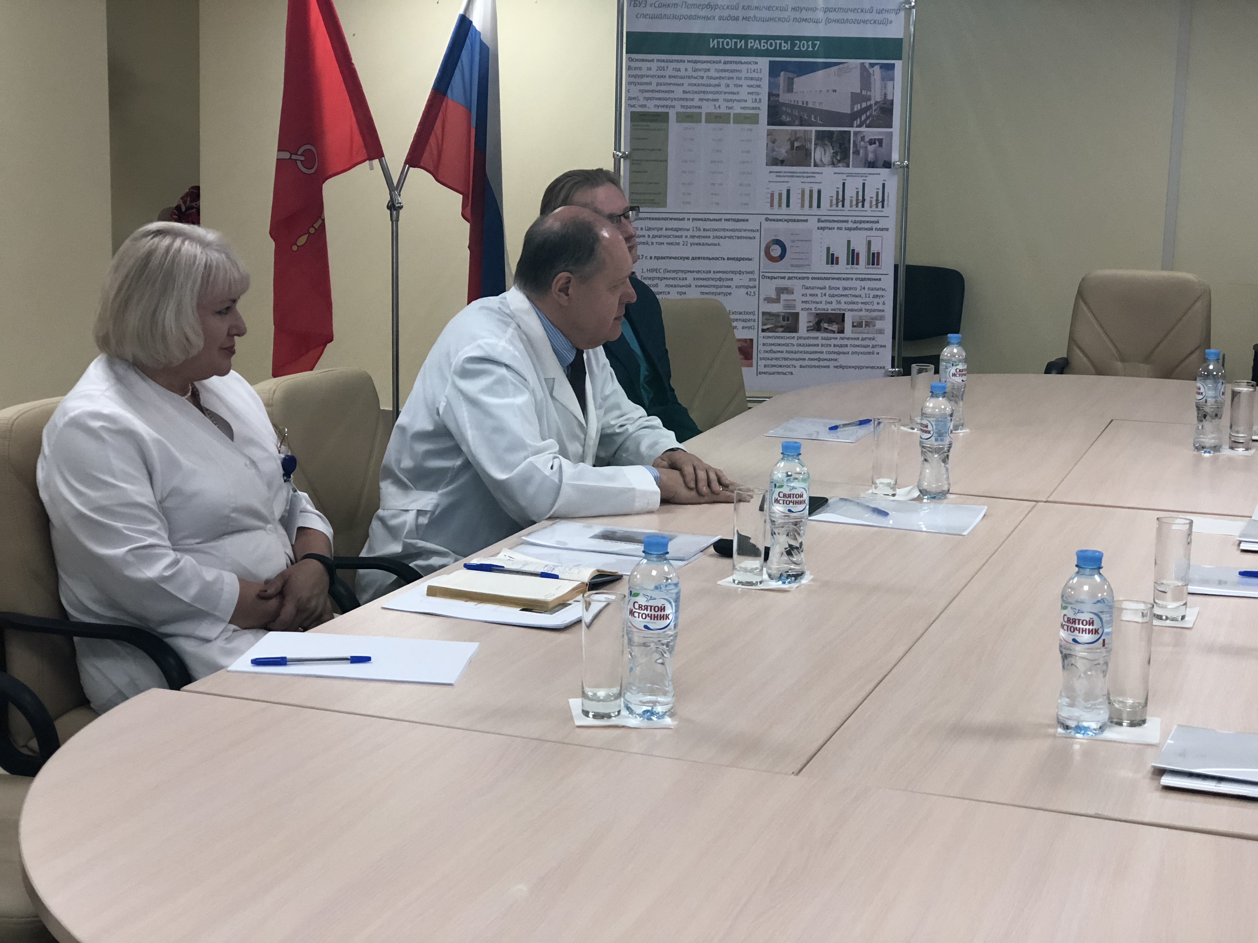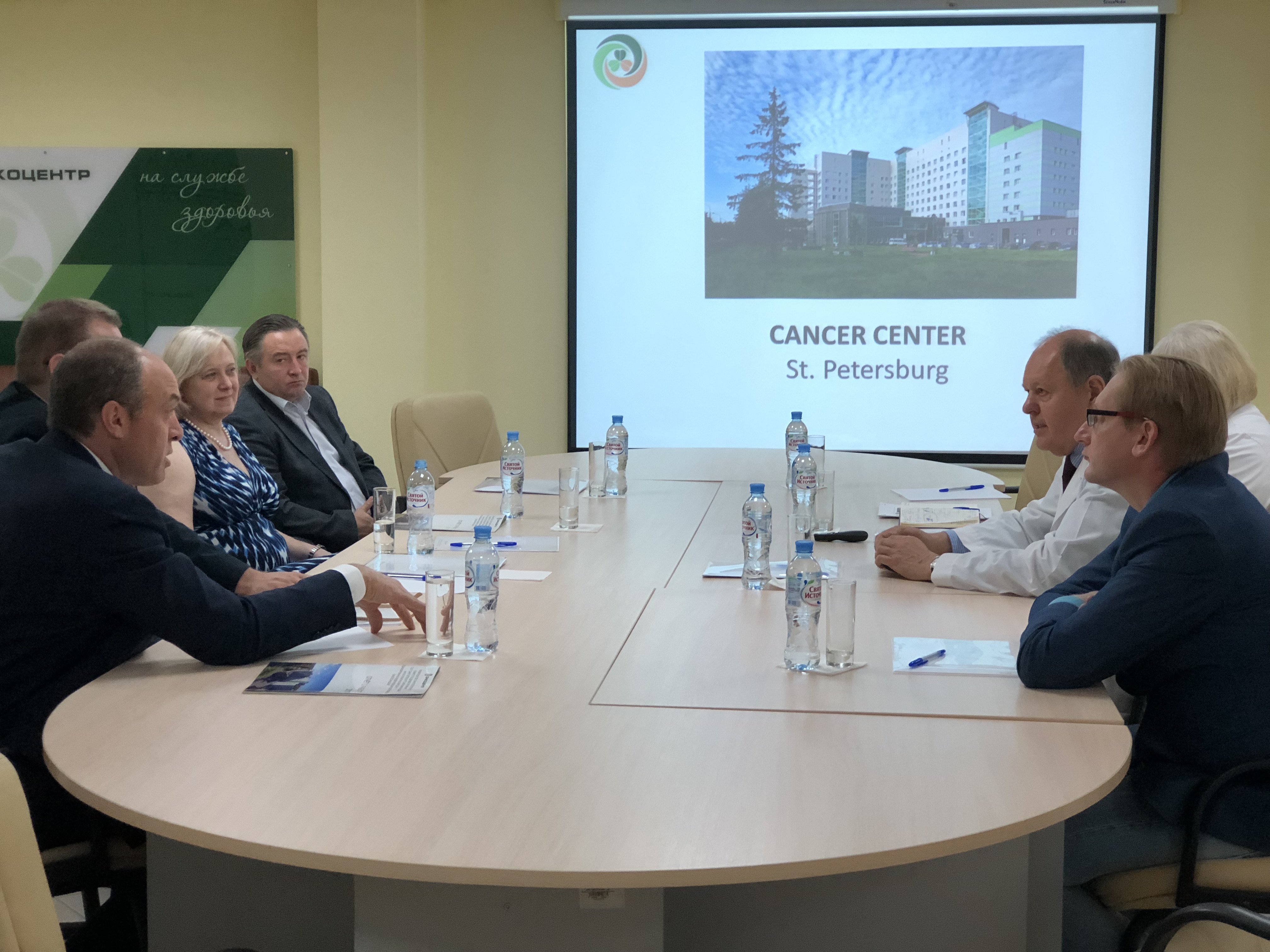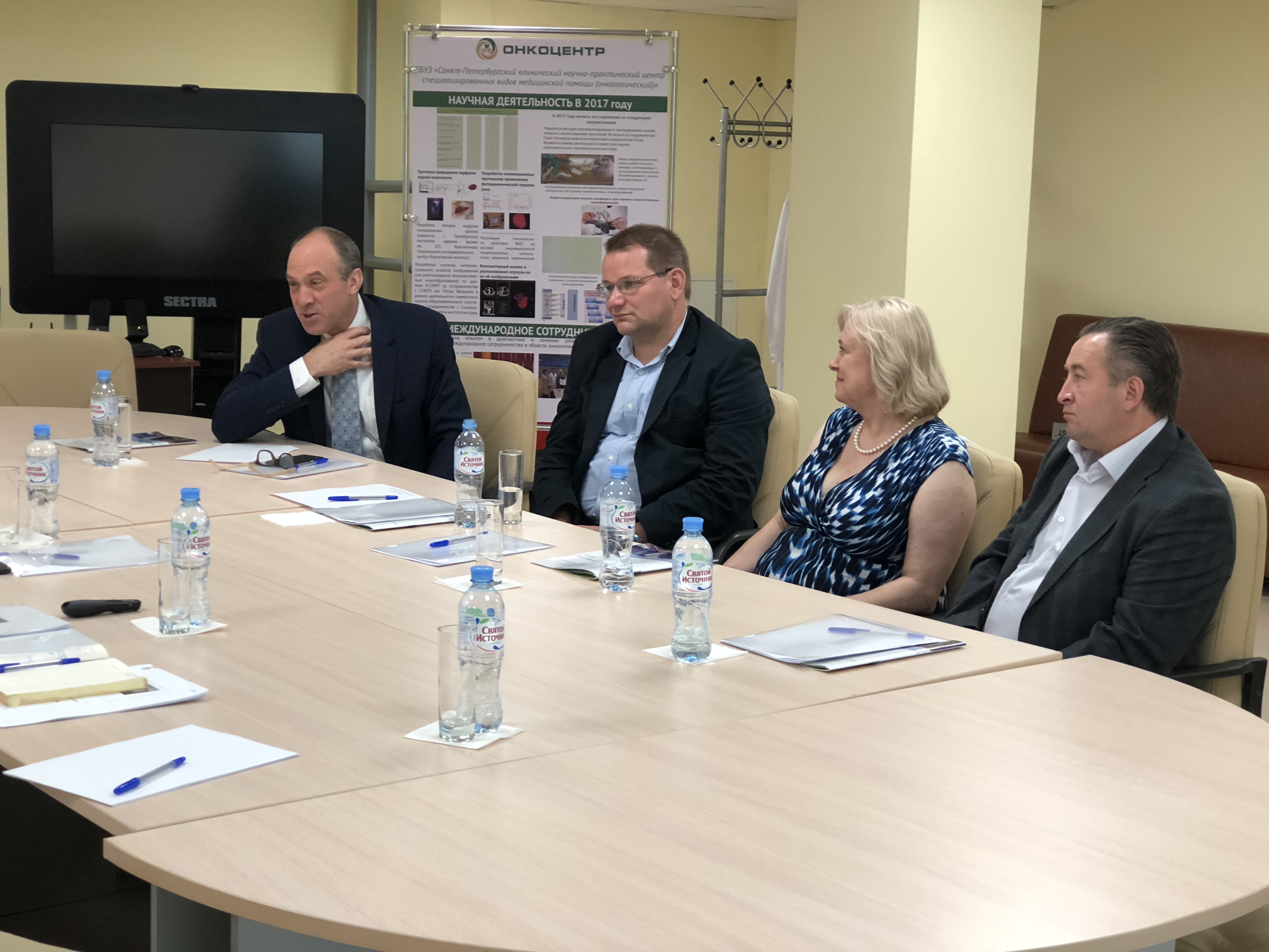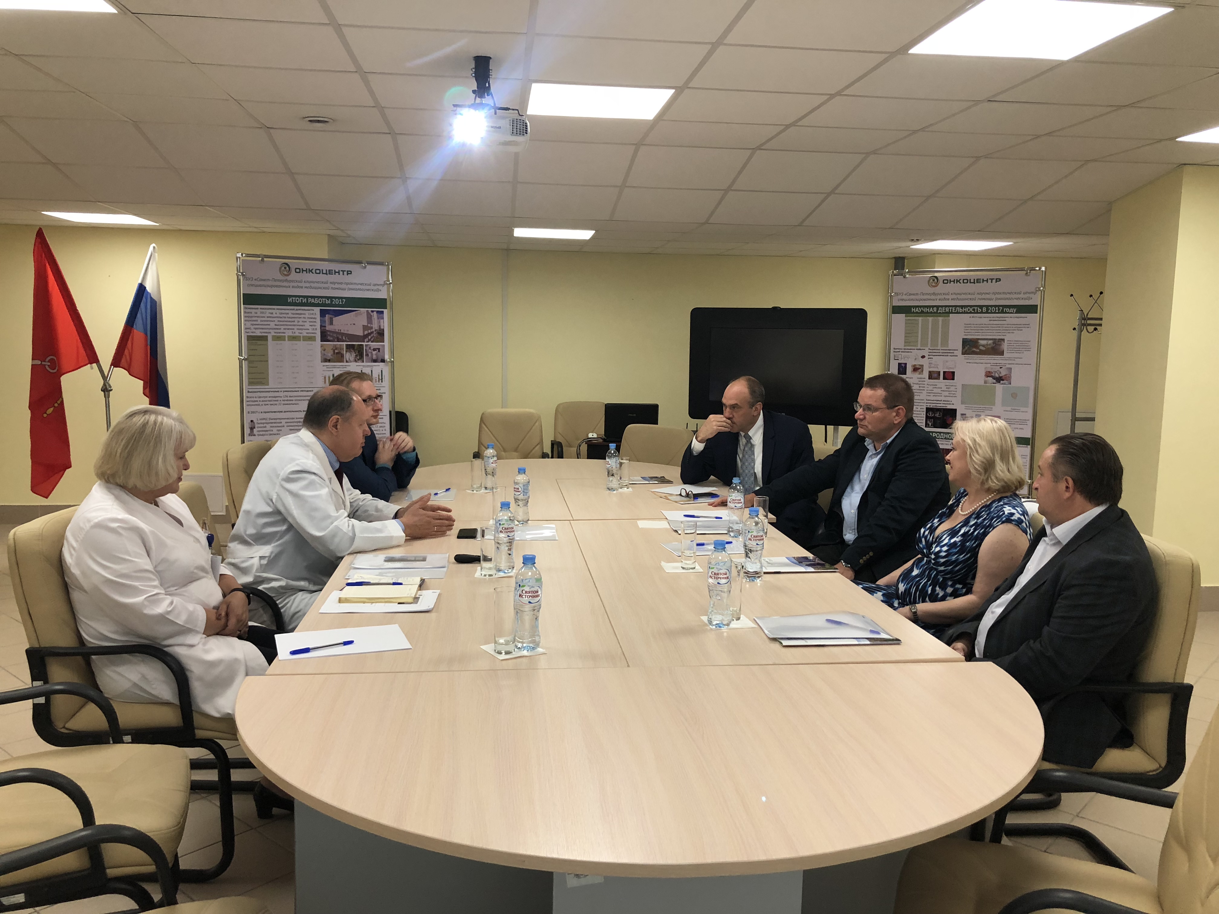 Во встрече с директором Онкоцентра, профессором Владимиром Михайловичем Моисеенко приняли участие ведущий специалист Госпиталя Йельского университета, гематолог, Николай Подольцев и и президент Международного фонда развития медицинской науки и образования «Здоровое сердце», д.м.н. Мария Прокудина.