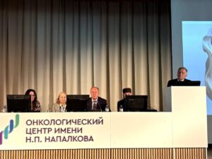 Программа конференции получилась насыщенной и многогранной. Доклад Владимира Михайловича Моисеенко «Рак и возраст: как механизмы старения связаны с развитием онкологических заболеваний» представил комплексный анализ молекулярных и клеточных механизмов, которые связывают старение с повышенным риском онкологических заболеваний. В выступлении освещалась роль геномной нестабильности и накопления мутаций с возрастом, обсуждалось влияние хронического воспаления («инflammaging») на канцерогенез, а также затрагивались изменения в иммунной системе, снижающие противоопухолевый надзор. Кроме того, спикер обозначил перспективы превентивных стратегий для пожилых пациентов. Аудитория активно задавала вопросы о скрининговых программах и персонализированных подходах к профилактике рака у пожилых.
