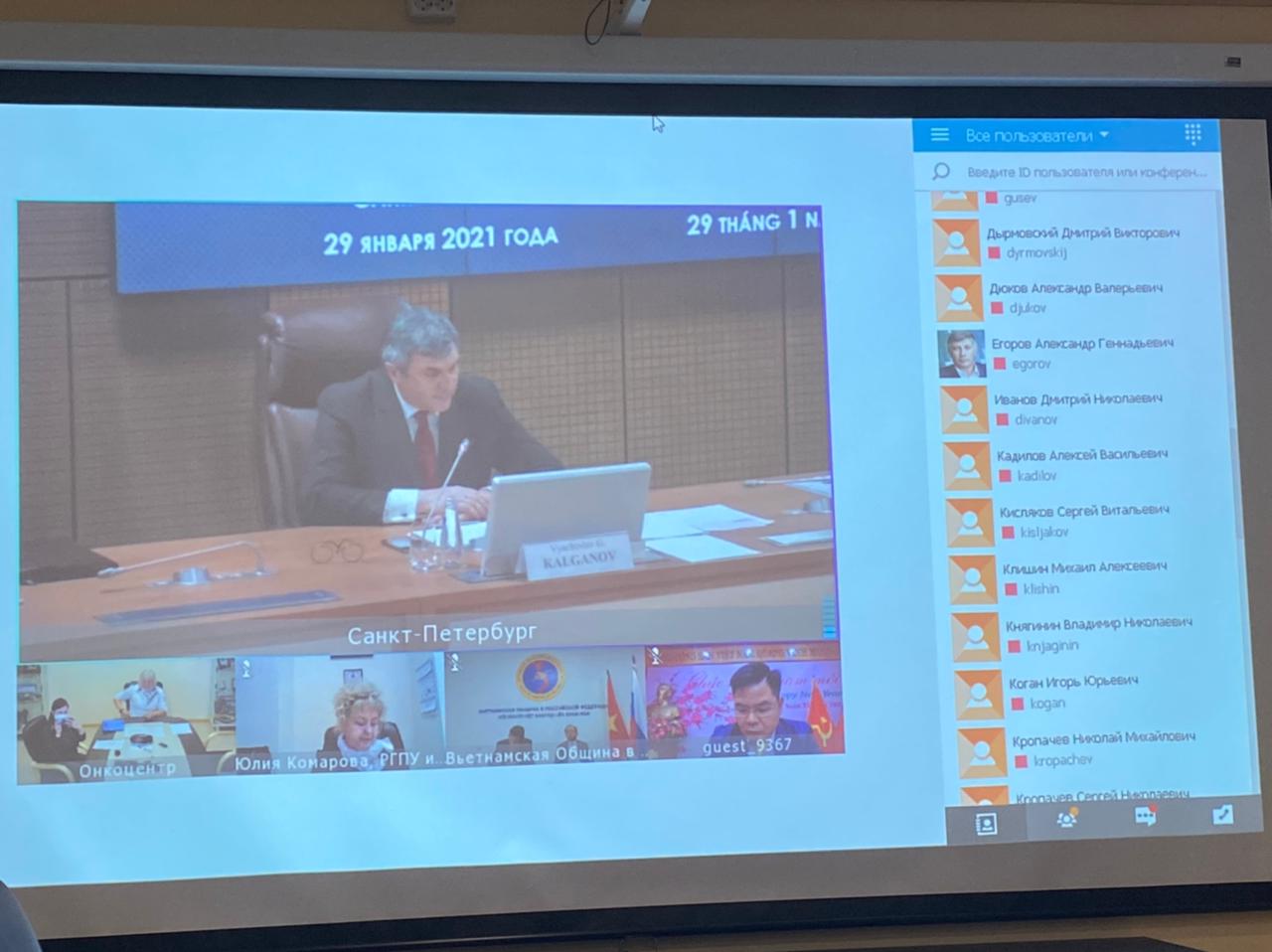 Петербургский онкоцентр на мероприятии представили Заместитель директора по медицинской части (по хирургической помощи) В.В.Егоренков и Заместитель директора по организационно-методической работе С.Н.Григорьева, которая также выступила с речью, посвященной истории развития отношений онкоцентра с медицинскими учреждениями Социалистической Республики Вьетнам. В выступлении также были затронуты вопросы перспектив развития сотрудничества в сфере онкологии, изменений в привычных видах кооперации, вызванных распространением коронавирусной инфекции COVID-19, и внедренных в этой связи протоколов, регламентирующих способы оказания специализированной медицинской помощи, обеспечения безопасности жизни и здоровья пациентов и медицинского персонала.